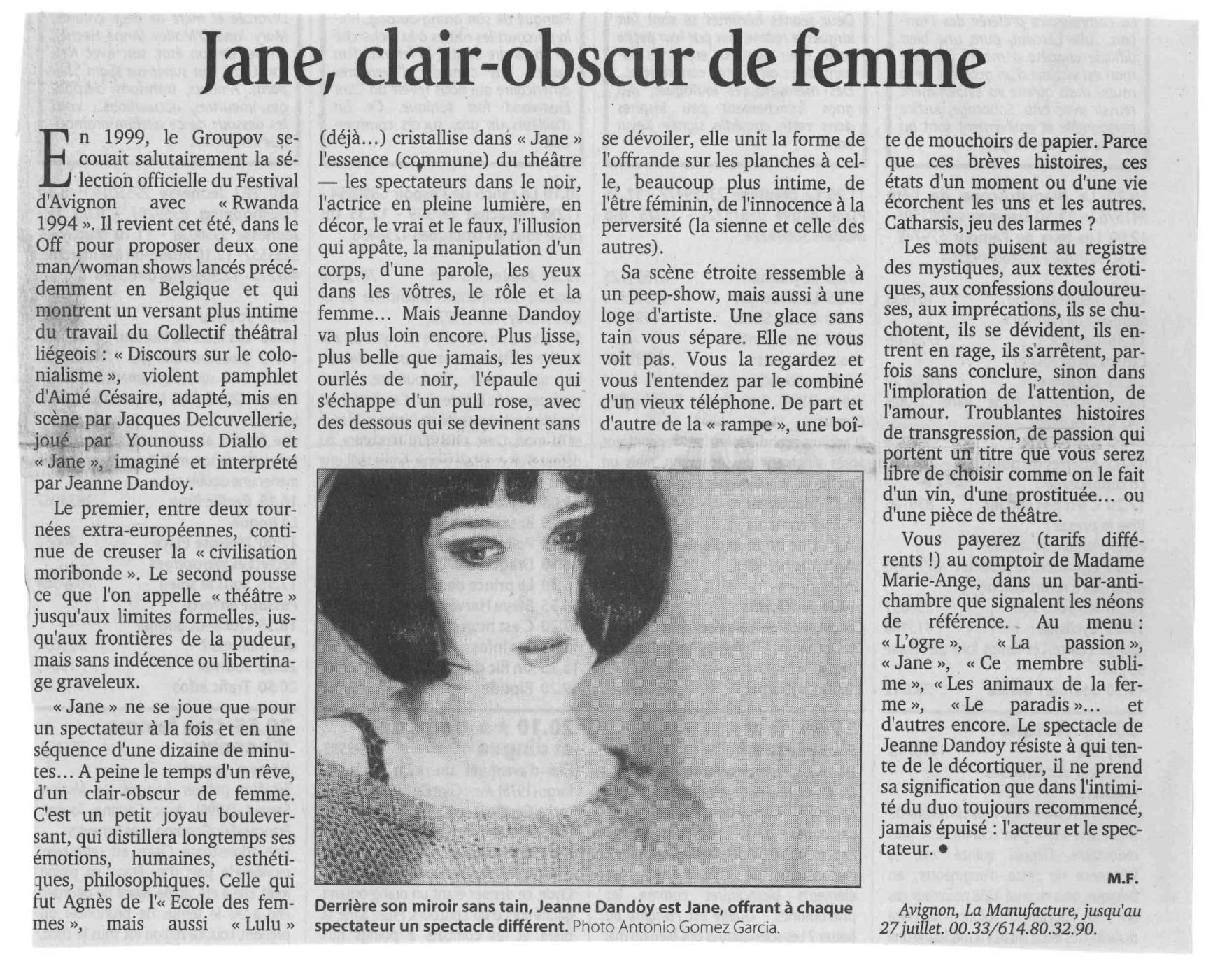 Ce spectacle, je l’ai créé à 26 ans, et j’ai tout de suite eu la conviction qu’il s’agissait d’un objet à part. Je le vois plus comme une performance qu’un spectacle de théâtre. Alors bien sûr il y a spectacle, puisque «un autre» s’exprime à travers moi, devant un.e autre (spectateur.ice), dans une forme particulière… Le projet initial, je l’ai pensé comme un questionnement profond de l’histoire de la représentation de femmes, des actrices. Très logiquement, j’ai eu envie de le reprendre, de voir comment le personnage, les textes, et surtout la forme globale et le rapport ténu au spectateur évolueraient avec l’âge, un corps qui se transforme, un vécu en évolution, parfois chamboulé. «Jane» évolue avec ma vie, et c’est aussi ce qui en fait une forme à part et, je l’espère interpellante, à l’instar de certaines performances de Sophie Calle.