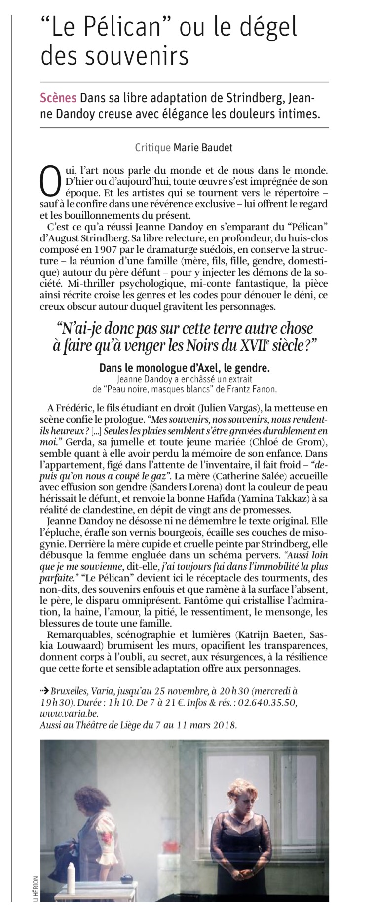 Dans ce «thriller psychologique onirique» la figure patriarcale cristallise les non-dits, l’amour, la haine et les blessures de toute une famille. Et bien au-delà du cadre familial, c’est la société entière qui se voit passée au crible d’un oeil interrogatif perplexe… Abus de pouvoir, abus sexuels, racisme, misogynie… habitent les corps de ces êtres prisonniers d’un appartement glacé qu’il faudra brûler pour pouvoir (ré)habiter son intimité, sa vie, son futur…